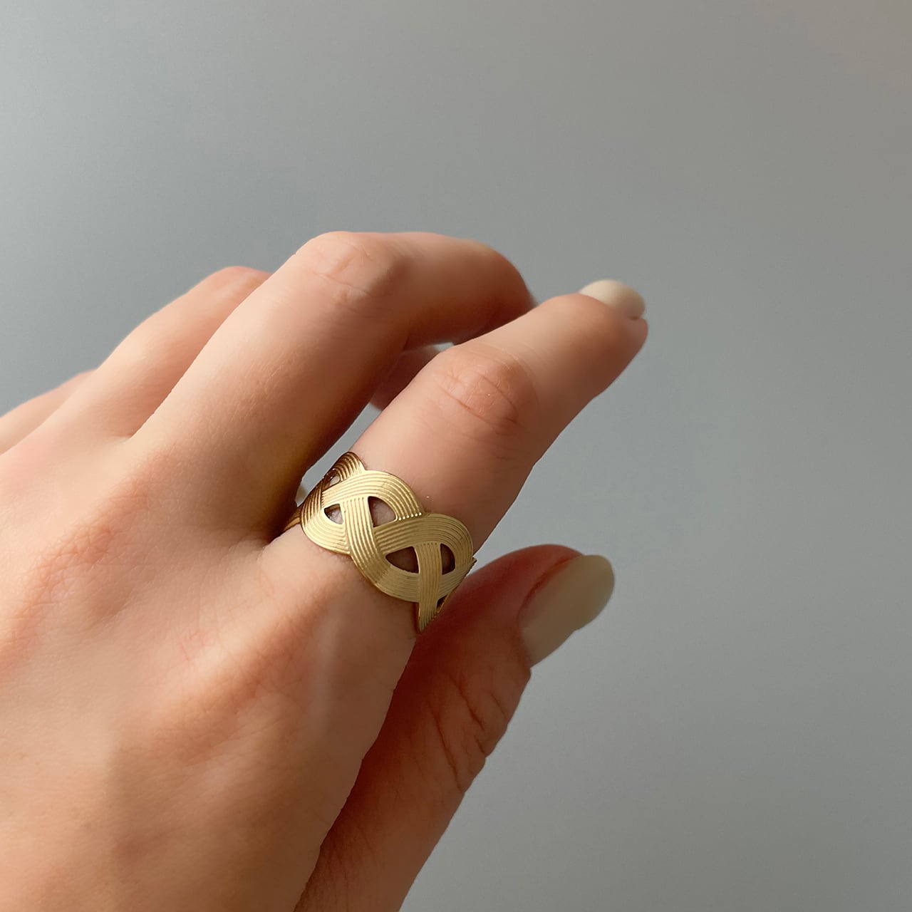 優雅な曲線で布を織りなしたようなかたちのリングです。
